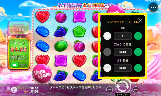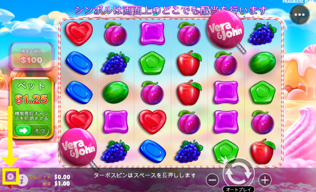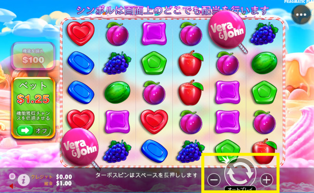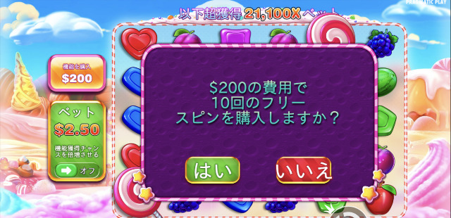 確実にフリースピンを発動させたいときは、フリースピン購入機能を利用しましょう。スイートボナンザベラジョンは、ベット額の100倍でフリースピンの購入が可能です。