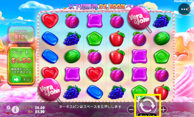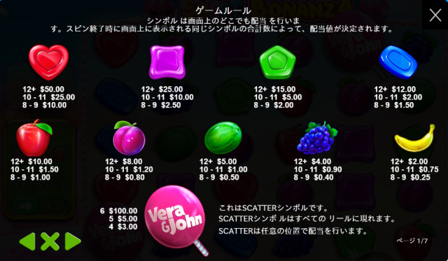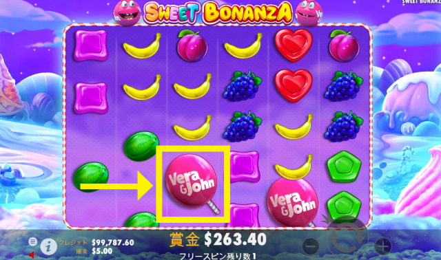 スイートボナンザベラジョンでは「Vera&John」のロゴマーク入りキャンディーがスキャッタ―シンボルとなっています。