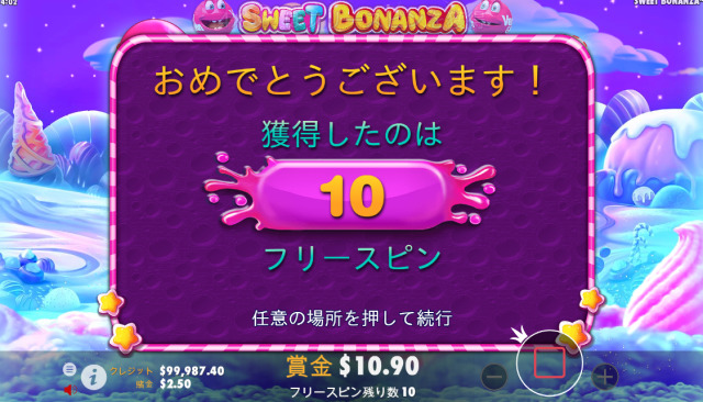 スイートボナンザで高配当を獲得するためには、フリースピンに突入できるかどうかが鍵になります。リール上にスキャッタ―シンボルが4個以上出現すると10回のフリースピン獲得となり、下記の画面が出てきます。
