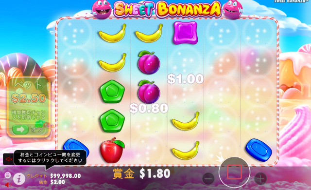 スイートボナンザベラジョンは落ちゲータイプのスロットなので、配当が成立するとシンボルが弾け飛ぶように消える演出が入ります。