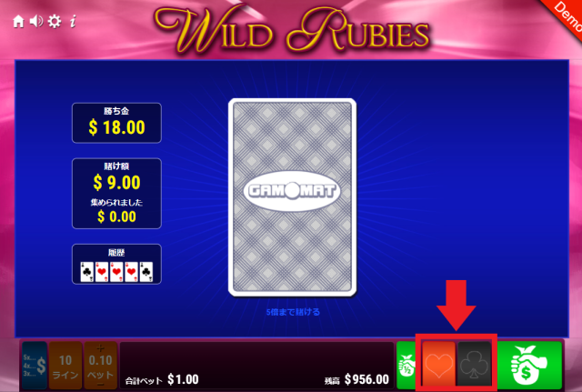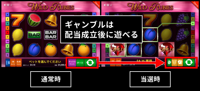 ワイルド・ルビーズは配当成立後、『払い戻し確定』『カードギャンブル』『ラダーギャンブル』『再スピン』のいずれかを選択できます。