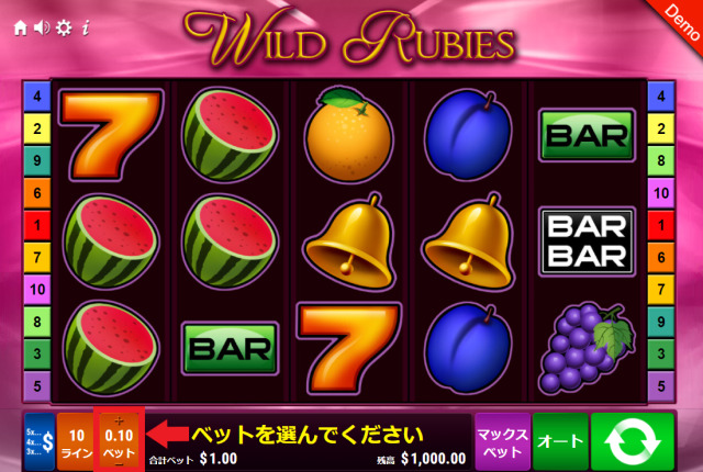 ワイルド・ルビーズのゲーム画面を開いたら、まずはベット額の設定から行います。