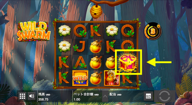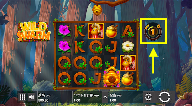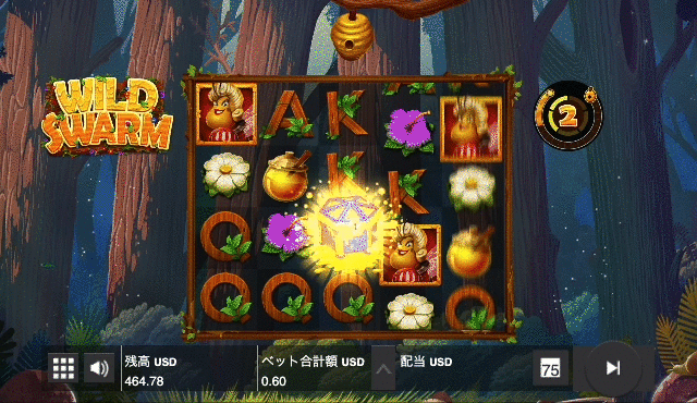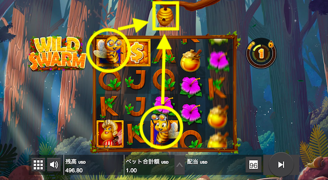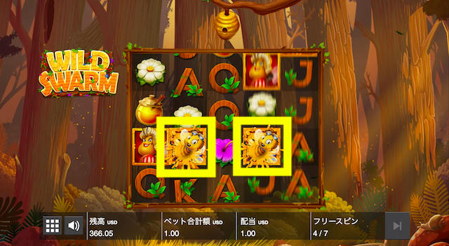 スピン開始前に、大量の蜂の群れがスロット上にネバネバワイルドシンボルをランダムで配置してくれます。