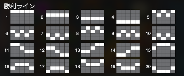 ワイルド・スウォームのペイラインは全部で20通りあり、ペイライン上に同じシンボルが左から2〜3個以上揃えば配当成立です。