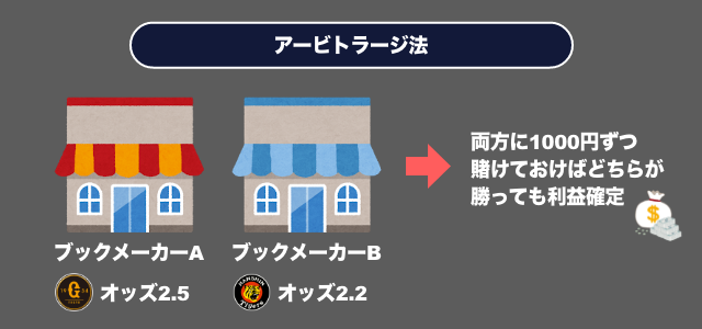 例えば、巨人対阪神の試合で、巨人が勝ったらブックメーカーA社で利益が出て、阪神が勝ったらブックメーカーB社で利益が出るようなオッズを探します。オッズを見つけたら、あとはそれぞれのブックメーカーに同額を賭けるだけです。どちらが外れても必ず利益が獲得できます。(ただし、引き分けなどの場合は損失が大きくなります。)