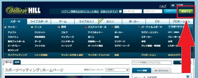 ウィリアムヒルスポーツカジノの登録手続きは公式サイト上部の「登録する」から行ってください。