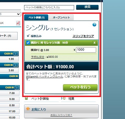 賭けたいオッズを選択したら、賭け金を入力し、「ベットを行う」をクリックします。