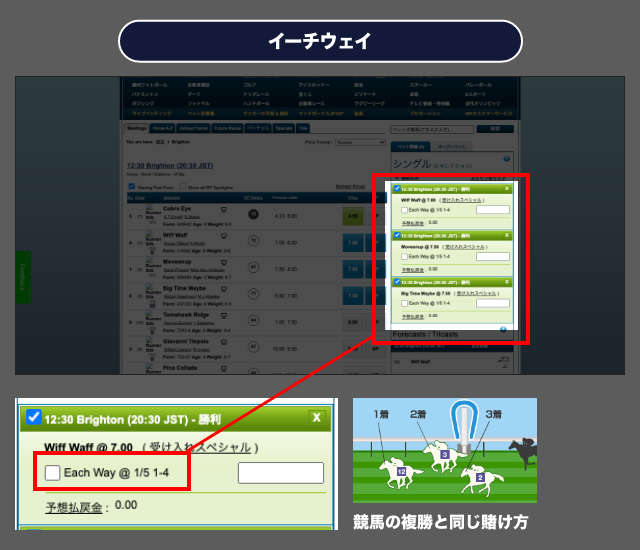 イーチウェイは、複数の選手/チームが競う大会や試合において、ベット対象が1位にならずに2位以下となっても配当がつく賭け方です。*競馬の複勝と同じです。