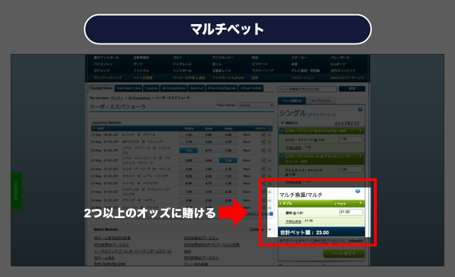 マルチベットは、2種類以上のオッズを組み合わせてベットする賭け方です。ブックメーカーによってはコンボベットと呼ばれたりします。