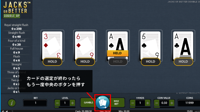このフェーズでは役を作るために捨てるカードと残すカードを選定します。カードを変更したい場合は『HOLD』のマークが付いた状態にします。逆に残したい場合は、『HELD』のマークが付いた状態にします。