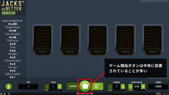 まずは、賭け金(BET)を決めてゲームを始めましょう。多くのビデオポーカーは、画面下にある「LEVEL」や「HANDS」が設定すると賭け金や配当を変更できます。