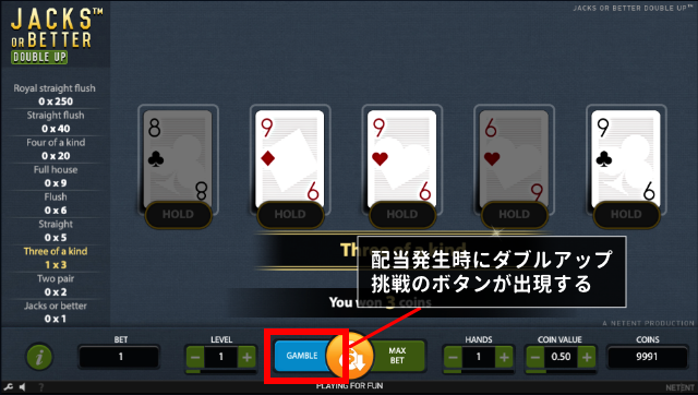 ダブルアップとは、ポーカーの役が揃ったときに挑戦できるボーナスモードで、勝てば配当が倍になりますが、負ければ勝った配当も没収されてしまいます。