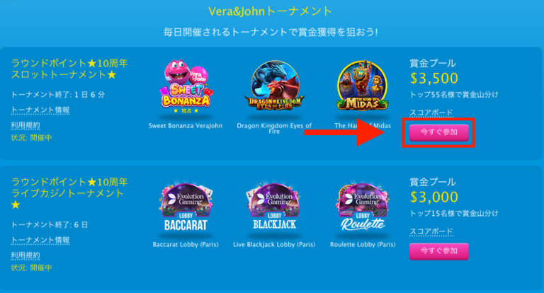 ウィークリートーナメントに参加する場合は、「トーナメント」の一覧の中から「今すぐ参加」をクリックして、参加表明をしましょう。