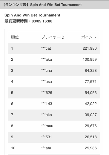 トーナメントでは100円をベットするごとに獲得できるポイントをどれだけ多く集めたかによって順位が変動します。