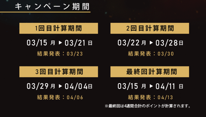 ポイントは1週間ごとに計算され、その都度上位入賞者に賞金が配布されます。最終回となる4回目だけは全日程を通して獲得したトータルポイントを競います。