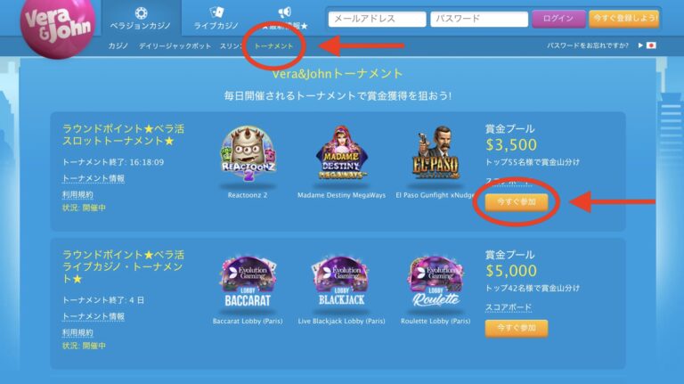 各トーナメントはいずれも参加表明が必要です。ベラジョンカジノの公式ページのメニュー欄にある「トーナメント」をクリックし、開催中のトーナメントの中から参加したいものを選んで「今すぐ参加」をクリックしてください。