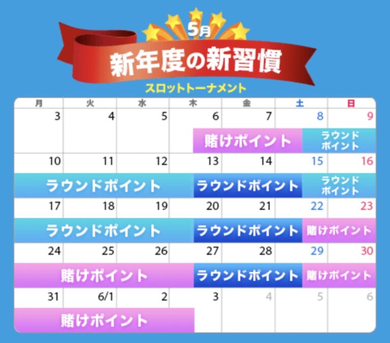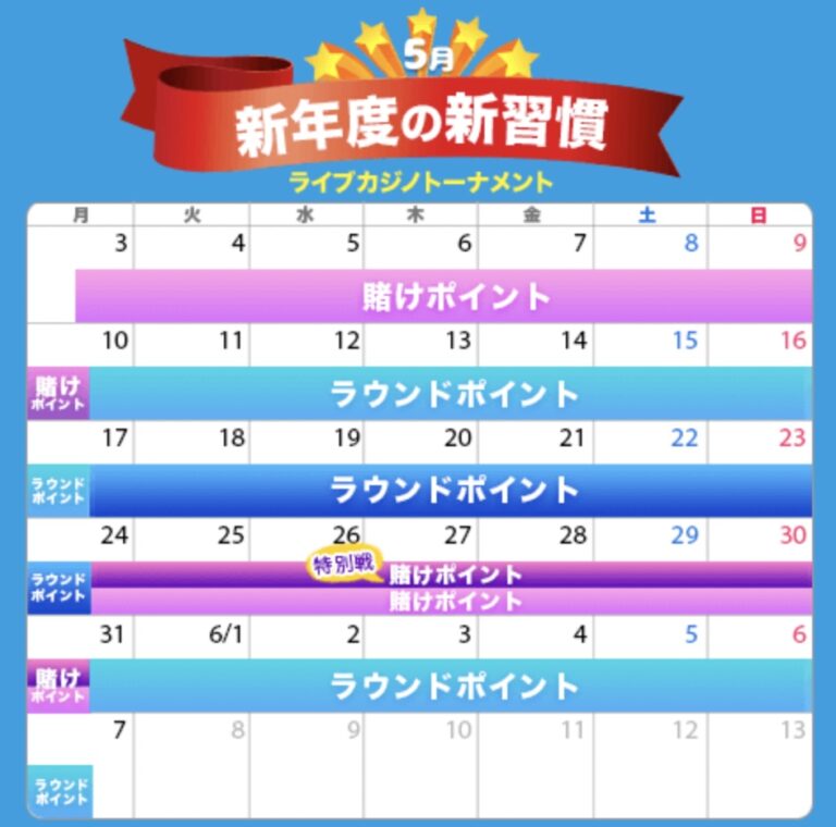 ライブカジノ・トーナメントの開催期間は2021年5月3日〜2021年6月7日、スロット・トーナメントの開催期間は2021年5月6日〜2021年6月3日です。