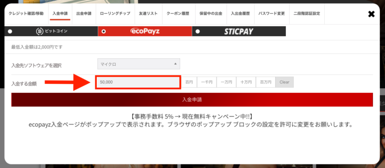 登録が完了したら、クレジットカード、ビットコイン、STICPAY、ecoPayzいずれかの入金方法で1度に最低5万円以上入金します。キャンペーンが適応となるのは初回入金のみなので、金額を間違えないように注意しましょう。
