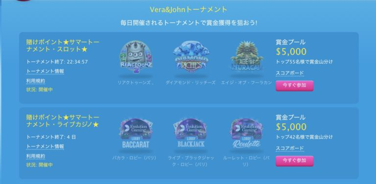 ベラジョンカジノでは「サマートーナメント」と称して高額な賞金がゲットできるトーナメントを開催中です。賞金はキャッシュでもらえるものと1倍の出金条件が付くボーナスキャッシュで獲得できるので、詳細をチェックして参加してみてください。