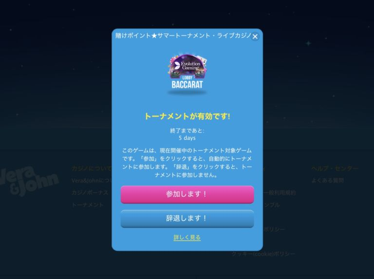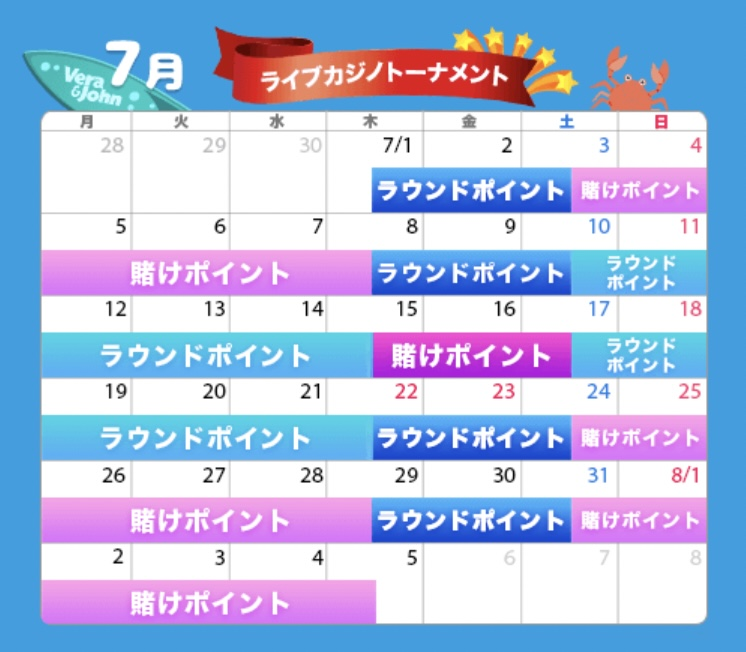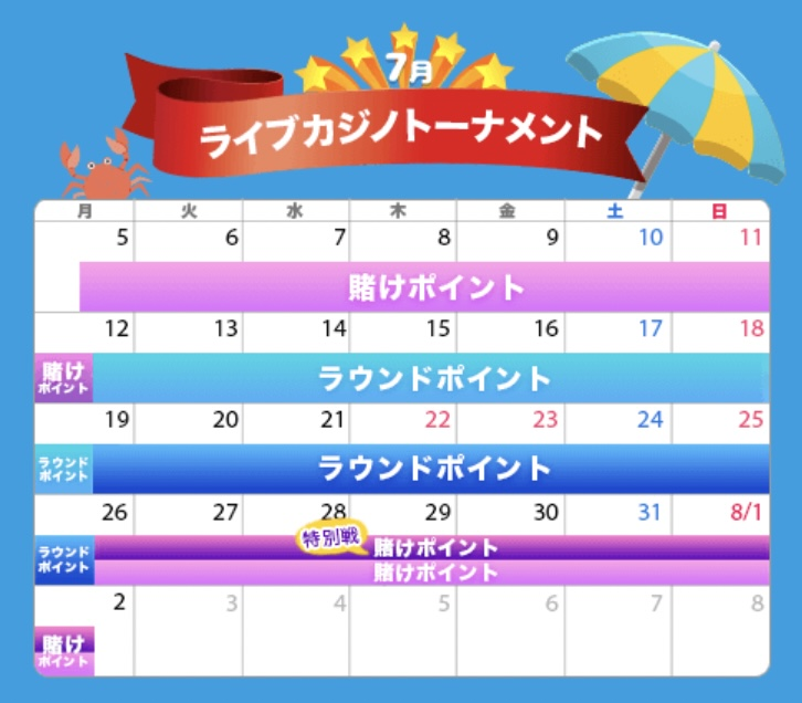 ライブカジノトーナメントの開催期間は2021年7月5日19:00〜2021年8月2日19:00で、毎週7日間に渡るトーナメントが開催されます。