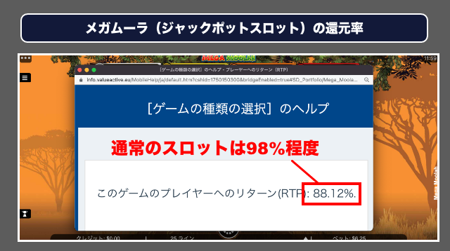 しかし、そういった大当たりはほぼ引けません。当たる確率は日本の宝くじ級の低さです。しかも最高賞金に配当を割り振っている分、ベースゲームの還元率は一般スロットに比べるとかなり劣ります。還元率90%を切ることも珍しくありません。