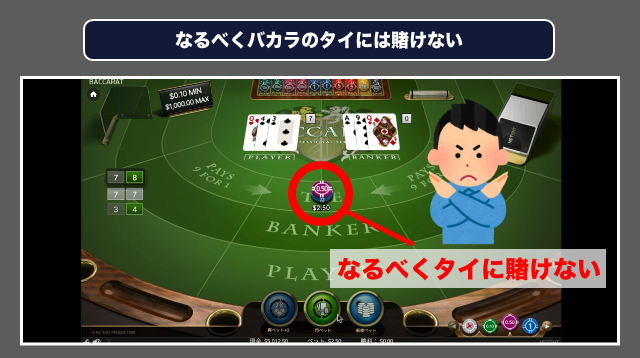 バカラで賭けるならプレイヤーかバンカーの2択、タイには賭けないこと。たったこれだけの戦略でも、タイに賭ける人よりずっと良い結果が期待できます。