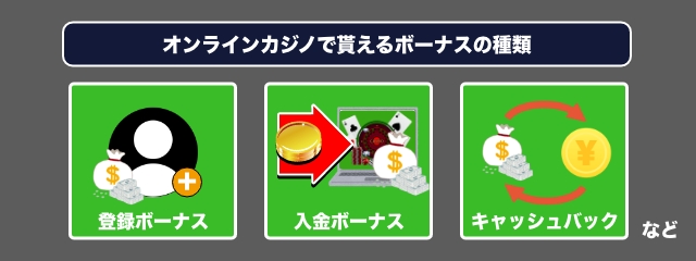 オンラインカジノはランドカジノとは異なり、カジノゲームで使えるボーナスがいくつか用意されています。