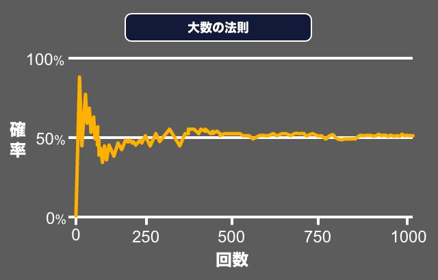 例えば、コインの表裏が出る確率は1/2ですが、実際にコインを投げてみるとどちらかに偏ることは珍しくありません。ただし、偏るのはあくまでも数十回程度実践した一時的な数値に過ぎず、何千何万と回数を増やせば統計的には1/2に限りなく近づいていきます。
