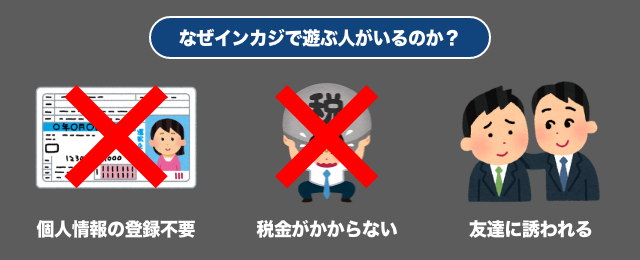 その点、インカジは個人情報の登録も決済方法の準備もいらないので、とても遊び始めやすいです。また、隠れて営業している分、遊んだことが外に漏れる心配もほぼありません。これは家族にバレることなくカジノゲームでギャンブルしたい人にとって1つのメリットといえます。(※警察に逮捕されたら遊んでいたことはバレます。)
