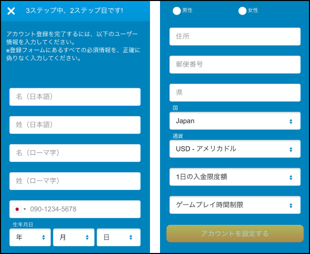 次に個人情報の入力になります。住所等に誤りがあると、後々アカウントを凍結されたり、トラブルの原因になるので、間違いがないよう入力してください。