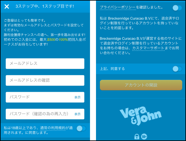 これらの情報は改めてオンラインカジノにログインする際に必要になるので、必ず忘れないでください。入力が完了したら【アカウントの開設】をクリックします。