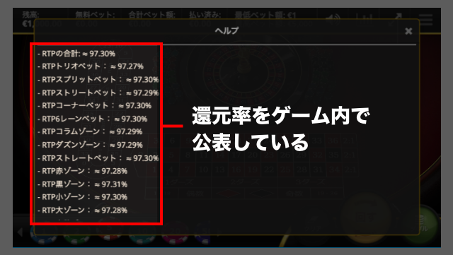 また、ソフトウェア会社が作成するカジノゲームは還元率(RTP)を公表しています。