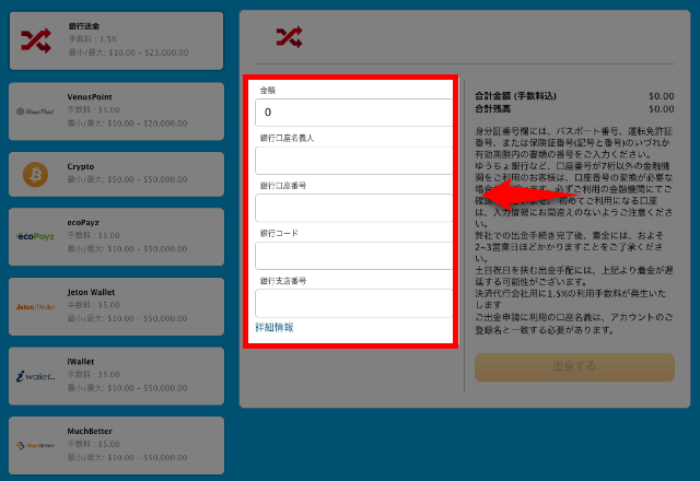 出金方法を選択すると、決済方法にあわせた入力画面が表示されます。