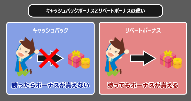 負けたら貰えるのがキャッシュバックボーナス、勝ち負け関係なく貰えるのがリベートボーナスと覚えておけばOKです。