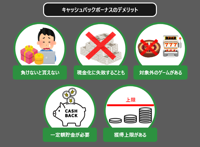 メリットで述べたとおり出金条件1倍はかなり低い設定ではあるものの、出金条件を消化しきれずキャッシュバックを失ってしまう可能性があります。