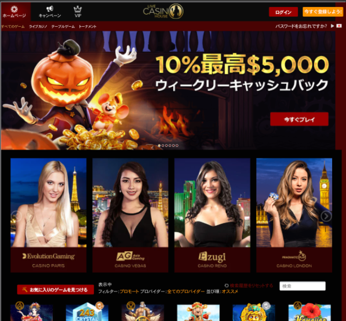 11種類のライブカジノソフトウェアを取り揃えるライブカジノハウスでは、毎週最大$10,000のキャッシュバックを獲得できます。