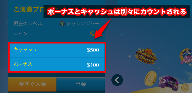 出金条件をクリアすると、ボーナスとキャッシュが別々にカウントされる分離型のオンラインカジノであれば、ボーナスおよび勝利金がキャッシュ残高に移し替えられ、ボーナス残高が0になります。