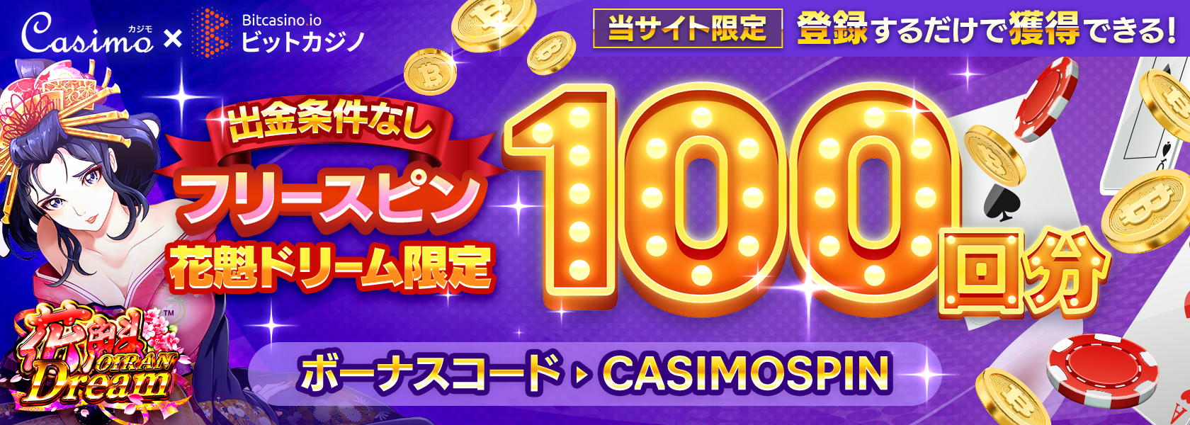 世界初の仮想通貨オンラインカジノとして名高いビットカジノ。入金不要ボーナスではCasimo限定で20ドル相当のフリースピンを100回分贈呈しています。