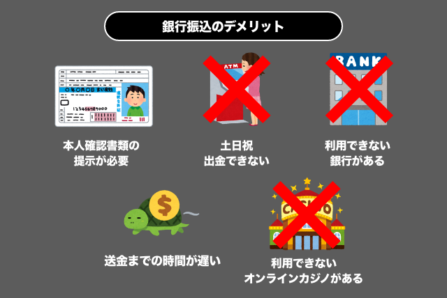続いて、オンラインカジノで銀行振込を利用するデメリットも確認しておきましょう。