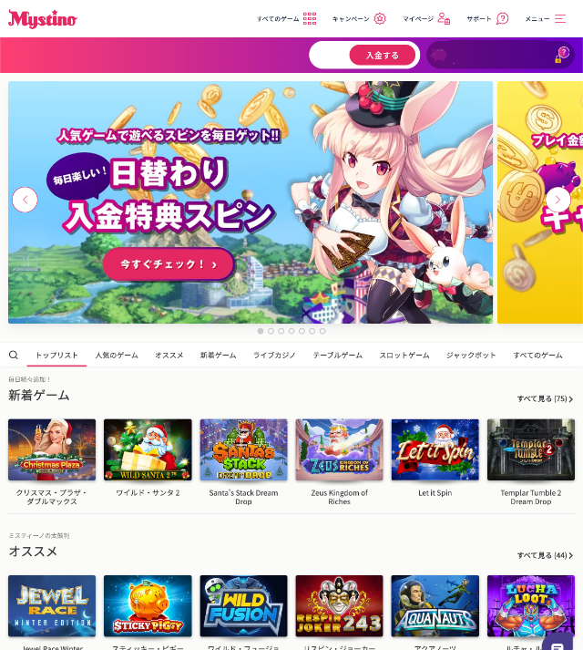 ミスティーノは2020年に出来たばかりの新鋭オンラインカジノです。出金条件なしの入金特典フリースピンや「サプライズキャッシュバック」といった斬新なサービスと、豊富な入出金手段や充実した日本語サポートなど安定した運営体制を持ち合わせており、初心者・経験者問わず人気を集めています。