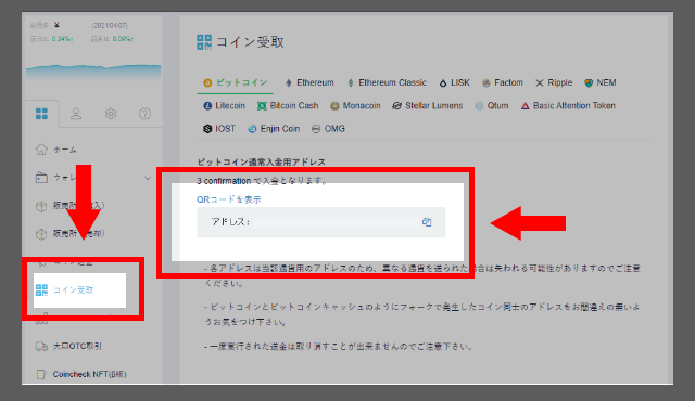 まずはビットコインの出金先にしたい取引所またはウォレットにて受取用のアドレスを取得します。