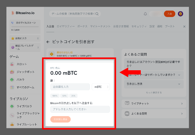 続いて、勝利金をビットコインで引き出したいオンラインカジノにログインし、出金画面を開きましょう。