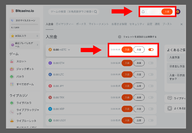ビットカジノでは、まず「入金」をクリックして、入金ページを開いてください。