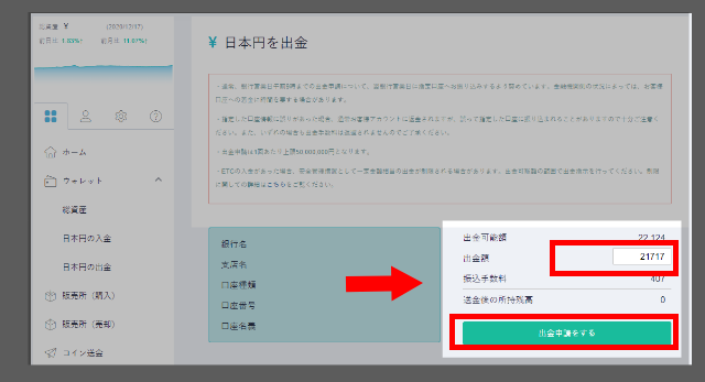 換金処理が完了したら、次は、取引所から銀行口座に日本円を送金する手続きを行います。