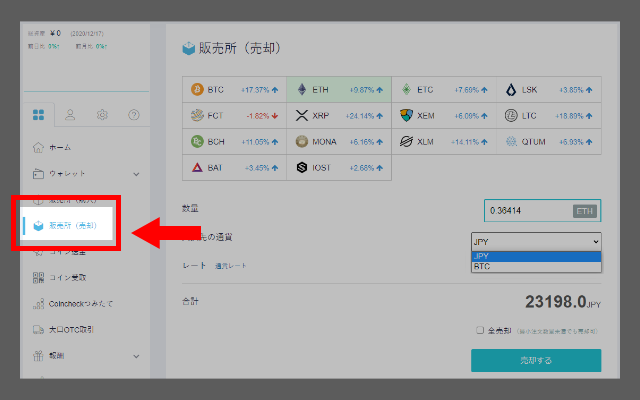 メニューにある「販売所(売却)」をクリックしてください。