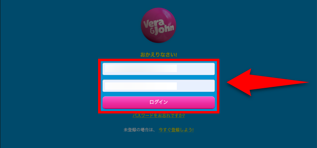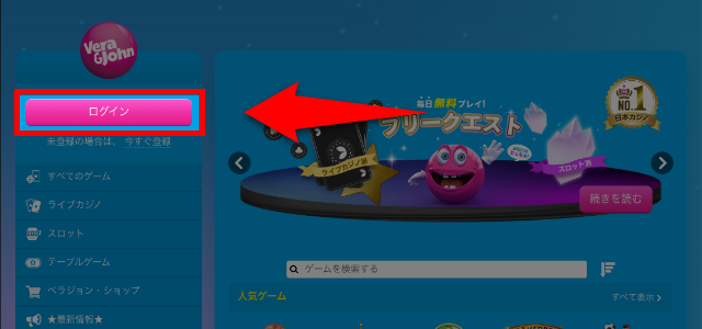 まずは、クレジットカードを使用して入金したいオンラインカジノへログインしましょう。ベラジョンカジノの場合、サイトにアクセスすると、トップページの左上にログインボタンがあります。