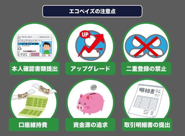 身元確認は、身分証明証や住所が特定できる書類の提出だけでなく、エコペイズの使用用途や出金する口座の利用明細などの提出が必要です。