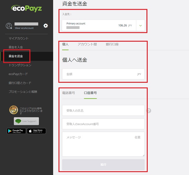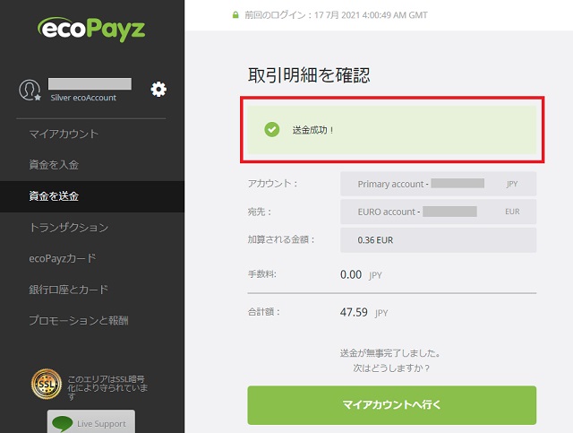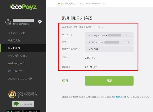 ご覧の通り、Classicランクの場合だけ、他方のエコペイズアカウントの送金すると1.50% (最低額 0.50 EUR)の送金手数料がかかります。
