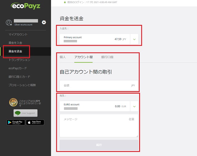 なお、Classicの場合でも、同一ユーザーが所有しているエコペイズのアカウント間の送金であれば手数料は無料です。ただし、通貨が異なる口座であれば、換金手数料がかかるため注意してください。