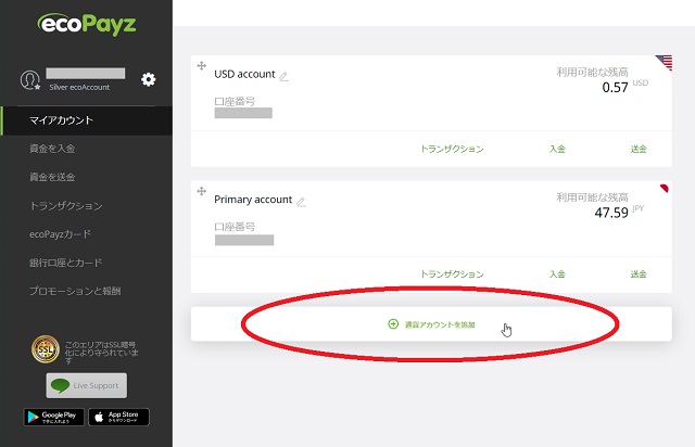 日本語対応オンラインカジノの多くは日本円(JPY)またはアメリカドル(USD)で遊べるので、エコペイズで2つの通貨アカウントを使ってオンラインカジノによって使い分けるようにすることをオススメします。通貨アカウントの追加は無料でできますよ。